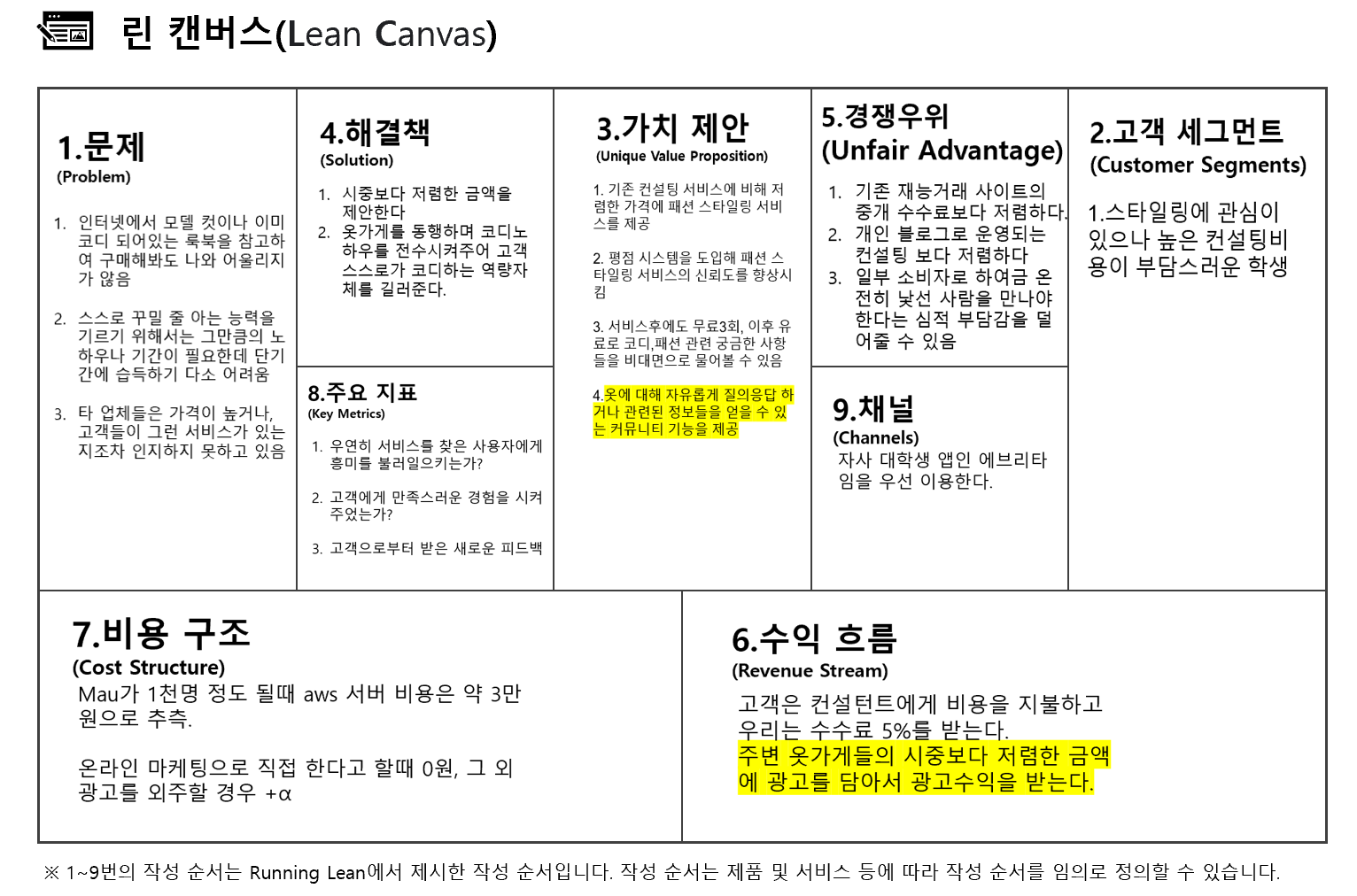 린스타트업을 베이스로 하여 진행하였고, 매 활동마다 발표를 병행하며 두번의 외부 멘토를 직접 찾아 컨넥해 한시간정도 이야기를 나누는 경험을 할 수 있습니다. 저희팀은 패션과외 라는 아이템과 더불어 플랫폼적인 성격을 띄고있었기 때문에 첫번째 멘토컨택은 심부름 플랫폼서비스의 1인창업자 대표님과, 두번째 멘토컨택은 실제 패션컨설팅 서비스를 오프라인에서 진행중이신 대표님과 진행하였습니다. 그리고 실제 불특정 다수의 교내 학생들, 패션디자인학과 학생들, 주변 가게들을 돌며 인터뷰를 진행하는 활동을 할 수 있었습니다.
