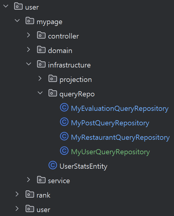 또한 queryRepo를 개별로 mypage에 두지 말고 개별 도메인들이 가져가야 하지 않느냐는 의견도 주었지만 이는 응집성 측면에서 상당히 좋지않다고 생각하였다. 마이페이지의 ui랜더링을 위한 조회로직을 개별 도메인들이 갖는것 자체가 srp위반이란 생각이 들었다.