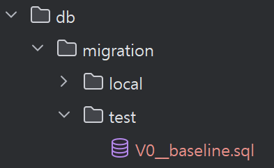 우리는 이미 flyway를 사용하고 있는 상태다. 하지만 v1부터 모든 테이블을 정의하면서 시작한게 아닌 기존 스키마가 갖춰진 상태에서 중간부터 도입을 한 상태다. 또한 과거 마이그레이션 데이터들을 모두 실행하는것또한 테스트코드 실행에 있어 속도감소의 영향이 있을것이라 생각했기에 우리는 최신 db를 간단하게 명령어로 dump로 가져와서 test전용 마이그레이션영역을 분리해준뒤, 해당 sql을 삽입해 사용하는 방식으로 하였다.